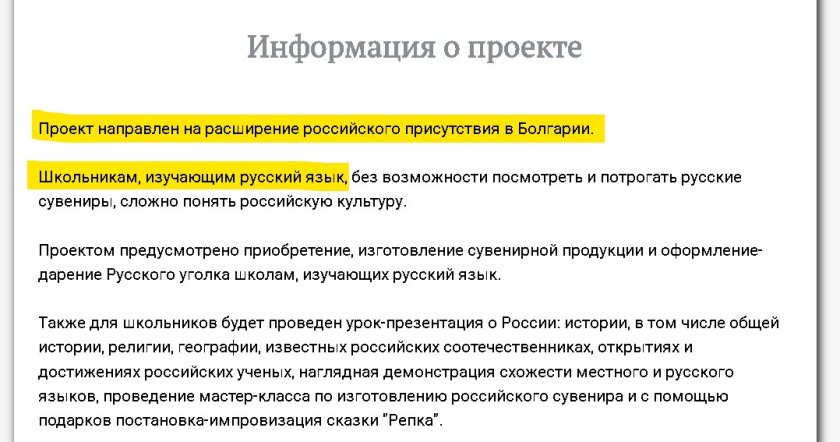 Основна роля имат проекти на руската държава и руската църква, които се осъществят у нас и които са изрично насочени към български деца. Тези руски организации финансират множество инициативи у нас, чиято единствена задача е да засили руското влияние сред младите.