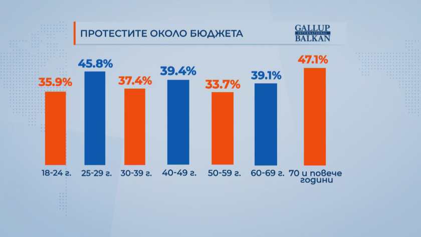 Интересно е разпределението по възрастови групи. Най-голям процент от хората, поставили на първо място „Протестите около бюджета“, са от най-възрастната група – над 47%, както и от представителите между 25–29 години – близо 46 на сто.