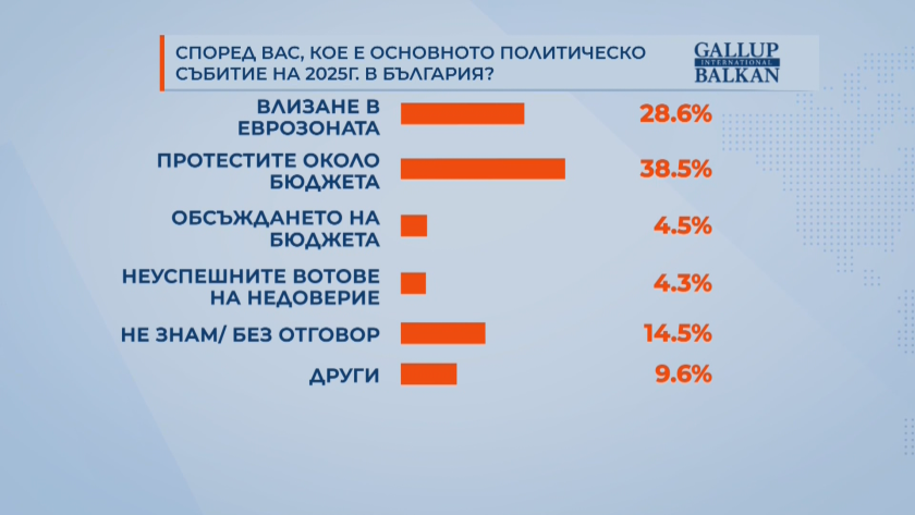 38,5% от анкетираните са посочили протестите. Приемането на България в еврозоната заема второ място с 28,6 на сто. Според агенцията тези резултати показват, че социално-икономическите проблеми остават водещ критерий, чрез който обществото оценява управлението и публичните политики.