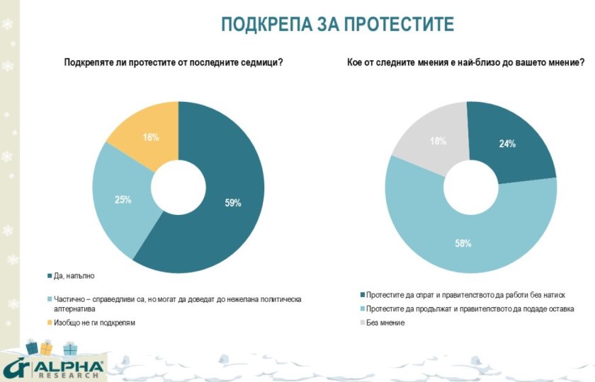 Одобрението доминира във всички социални и електорални групи, с изключение на симпатизантите на ГЕРБ-СДС и разколебаната позиция на привържениците на БСП и ИТН. Неодобрението от 16 на сто е далеч под сумата от електоралната подкрепа на управляващите партии. Между тези два полюса се разполага тенденция, която проучването регистрира – 25% смятат протестите за справедливи и поради това частично ги подкрепят, но се опасяват, че те могат да доведат до неприемлива политическа алтернатива. Тази позиция се споделя от всеки втори симпатизант на ГЕРБ, всеки трети на БСП и на "ДПС - Ново Начало" и много слабо – от привържениците на останалите политически сили.
