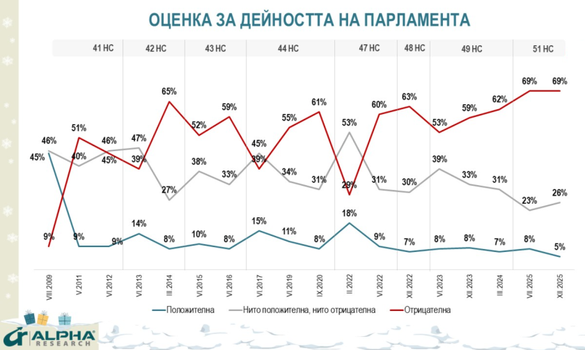 По-силна е обществената неудовлетвореност от дейността на 51-вото Народно събрание, превърнало се в терен на нестихваща политическа конфронтация и нелицеприятни сцени. В края на годината парламентът получава одобрение от едва 5%, неодобрение от 69% и 26% неутрално отношение, като дори привържениците на представените в него партии са силно критични.
