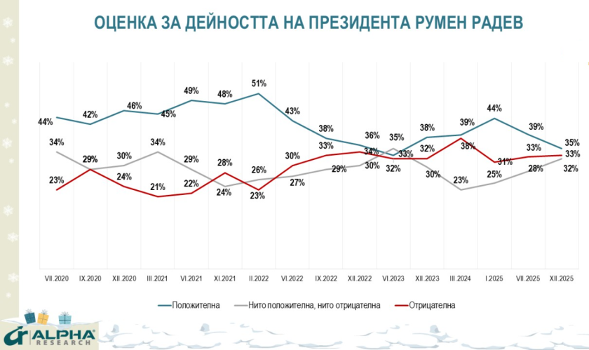 Президентът Румен Радев запазва водещи позиции по институционален рейтинг, но също е засегнат от цялостната негативна тенденция. Доверието в него спада с 4 пункта до 35%, срещу 33% недоверие и 32% неутрално отношение. Той продължава да привлича симпатиите на избирателите на БСП и националистически партии, но острите атаки срещу въвеждането на еврото и позициите му по геополитически теми дистанцират привържениците на проевропейски формации.