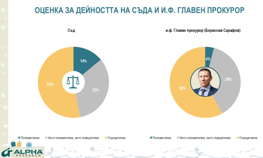 И през тази година обществените нагласи към съдебната система остават на обичайните равнища на недоверие. Най-критично е отношението към и.ф. главен прокурор Борислав Сарафов (4% положителни, 38% неутрални и 58% отрицателни оценки). Одобрението за дейността на съда е 14%, срещу 53% неодобрение и 33% неутрално отношение.
