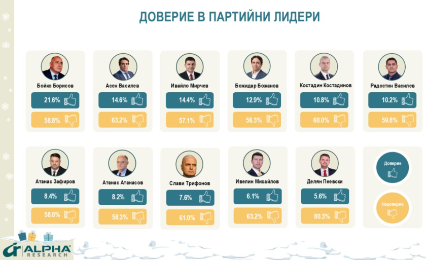 След като уловиха обществените настроения и подкрепиха масовите протести, ПП-ДБ влизат в положителна траектория. Вотът за тях нараства с почти 4 пункта и през декември стига до 17,8% от решилите да гласуват. Лидерите на коалицията не извличат лични дивиденти, но запазват добри позиции. Асен Василев получава 14,6% доверие срещу 63,2% недоверие, Ивайло Мирчев – 14,4% доверие срещу 57,1% недоверие, Божидар Божанов – 12,9% доверие срещу 56,3% недоверие. По-ниско остава одобрението за Атанас Атанасов – 8,2% срещу 58,3% неодобрение.