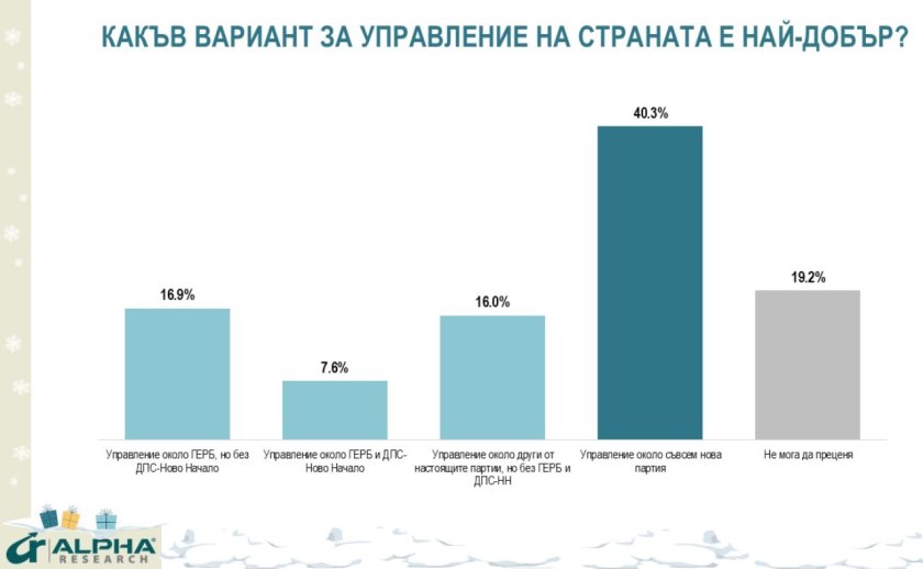 7,6% са за управление около ГЕРБ и "ДПС - Ново начало"; по 16 на сто, почти паритет, за управление около ГЕРБ, но без "ДПС - Ново начало" (16,9%) и за управление, изградено около други от настоящите партии, без тези две (16%). 40,3% предпочитат управление около "нова политическа сила".