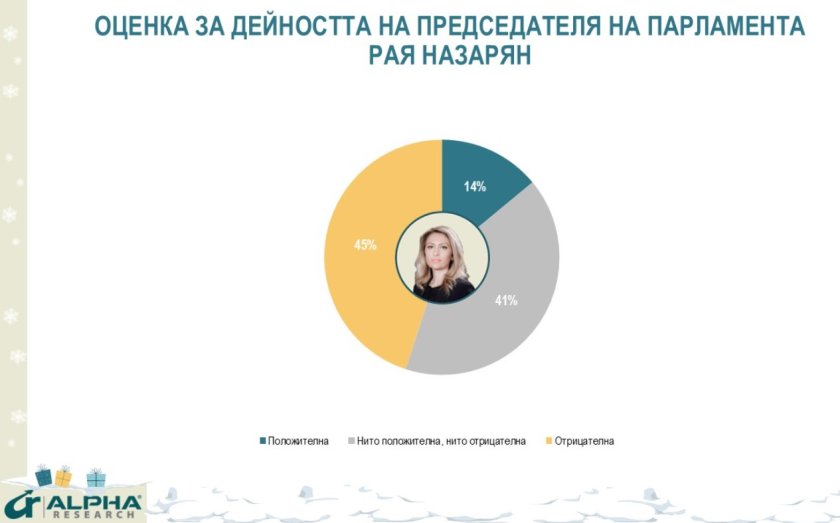 Председателят на парламента Рая Назарян се ползва с доверие от 14% (предимно симпатизанти на ГЕРБ), недоверие от 45% и 41% неутрални оценки.