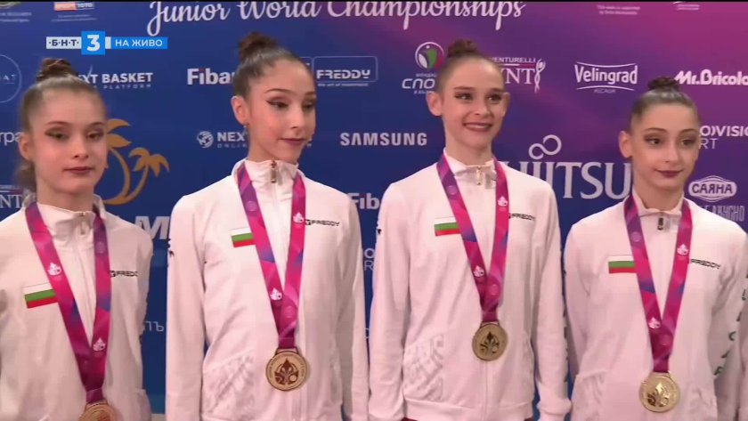 Българският ансамбъл по художествена гимнастика за девойки застана пред камерата на БНТ след втората си титла от световното първенство в "Арена 8888".