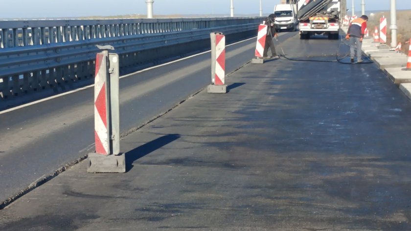 Асфалтиран е затвореният за основен ремонт 320-метров участък от "Дунав мост" при Русе. През последната седмица е положена хидроизолацията по пътната плоча и започна монтирането на парапета и стълбовете за осветление в платното в посока Румъния.