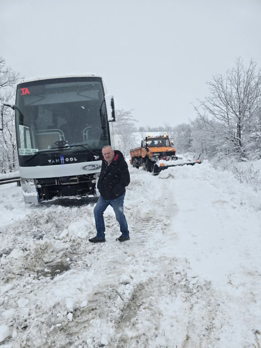 В момента екипи на пожарната и друга тежка техника работят по изваждането на закъсалия автобус.