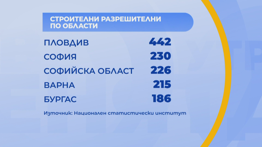 Най-голяма продължава да е активността в Пловдив – градът води класацията с 442 нови разрешителни и близо 3800 предстоящи жилища. В морските градове и около столицата също се вижда оживление - София-град, Софийска област, Варна и Бургас, а Благоевград влиза в челната петица с 445 нови жилища.