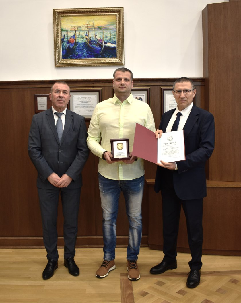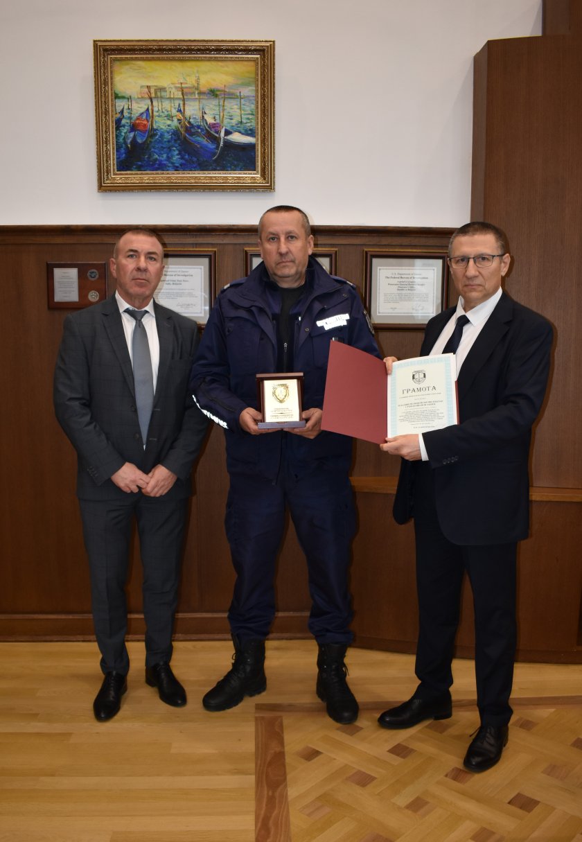 И.ф. главен прокурор Борислав Сарафов награди с грамоти и плакети "Прокуратура на Република България" главен инспектор Филип Благоев - началник на Районно управление - Ихтиман, старши инспектор Петър Георгиев - началник група "Криминална полиция" към РУ - Ихтиман и младши полицейски инспектор Стефан Зашев - група "Охранителна полиция" към РУ - Ихтиман. Отличията са за проявен висок професионализъм в изпълнението на служебните задължения при разкриването на въоръжен грабеж на голяма парична сума от инкасо автомобил, съобщиха от прокуратурата.