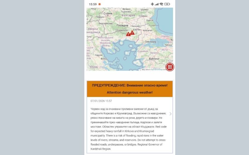 Червен код за очаквани проливни валежи от дъжд в общините Кирково и Крумовград. Областният управител на Кърджали издаде предупреждение за възможни наводнения, рязко повишение на нивата на реките, дерета и язовири. Гражданите са призовани да не преминават през наводнени пътища, подлези и залети мостове.