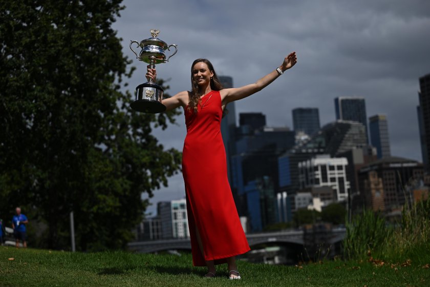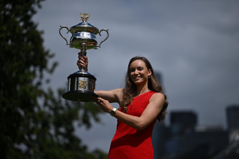 Елена Рибакина триумфира с титлата на Australian Open 2026 след епичен финал срещу Арина Сабаленка. Новата шампионка позира с трофея в традиционната фотосесия, облечена в стилна червена рокля.
