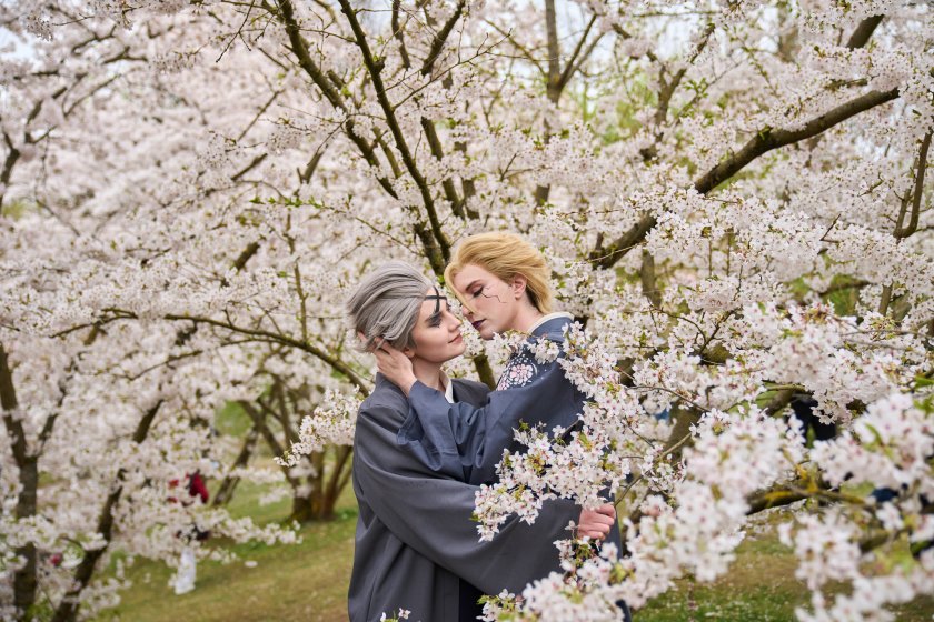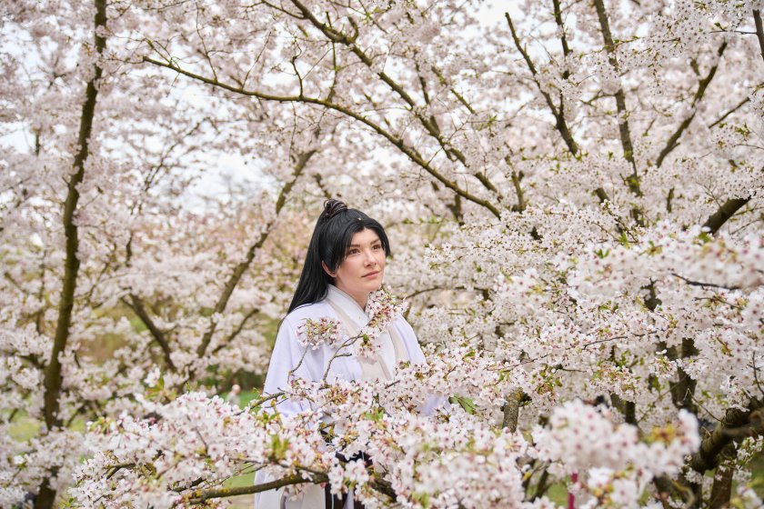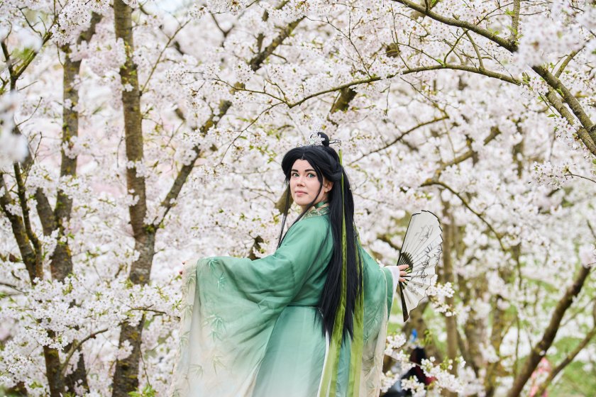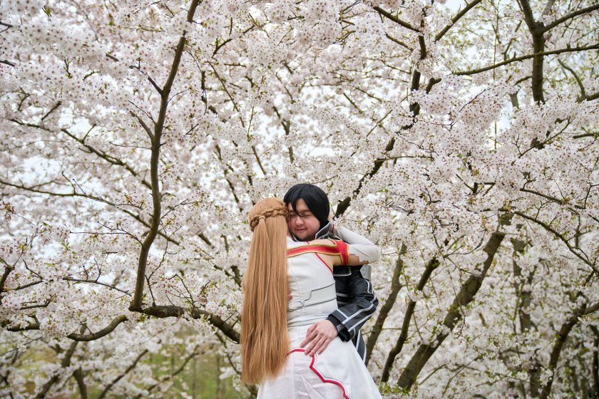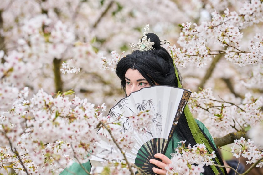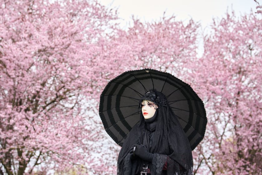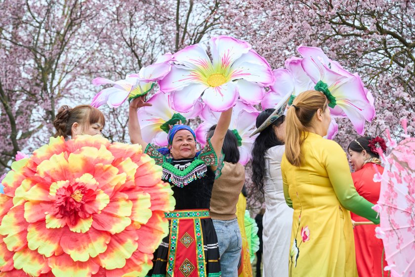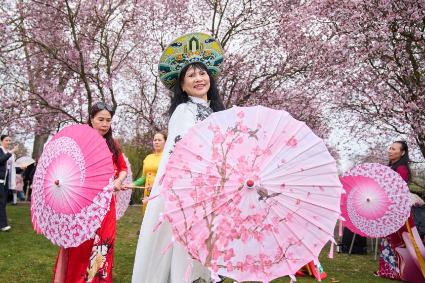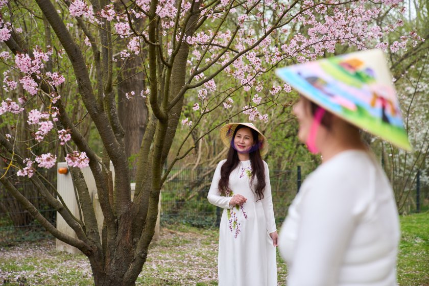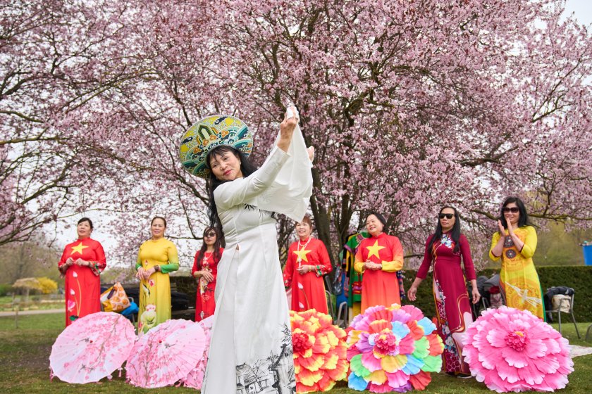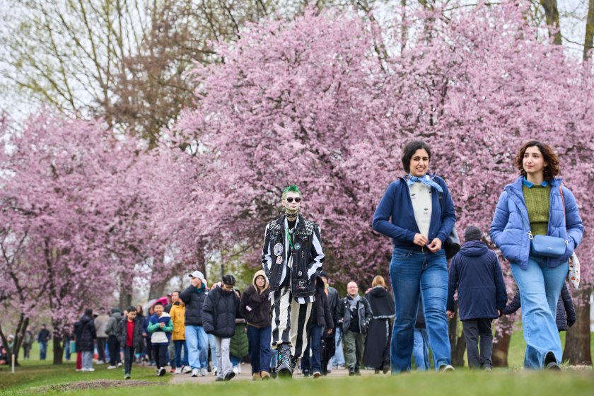 Хората се наслаждават на цъфтящите черешови цветове по време на Фестивала на черешовия цвят в Берлин, Германия.