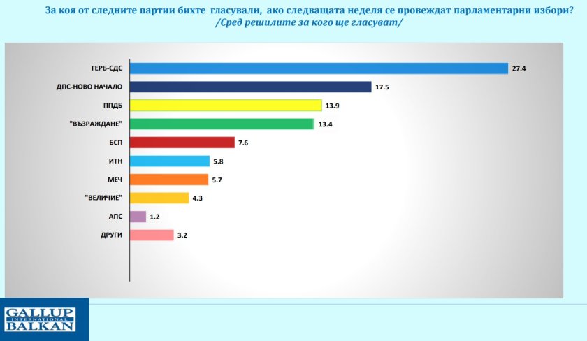 Сред решилите за кого ще гласуват ГЕРБ-СДС запазва убедителна водеща позиция с 27,4% подкрепа (при 25,7% през юли) – най-висок резултат от началото на годината. Значение за укрепването на електоралната подкрепа на формацията има дейността на правителството, последователната работа по ключови теми като присъединяването към еврозоната, изпълнението на Плана за възстановяване и устойчивост, поддържането на икономическа стабилност.