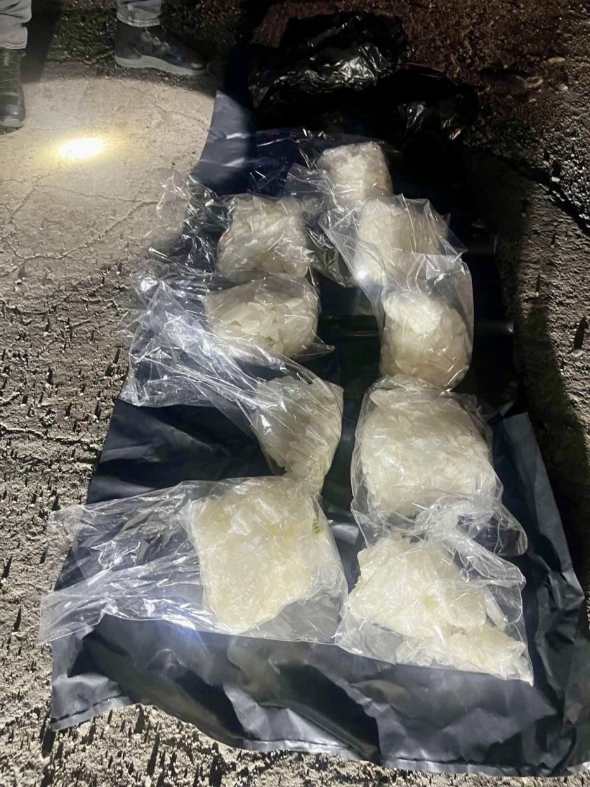 На задната седалка в колата са намерени 9 прозрачни найлонови торби с кристалообразно вещество, укрити в диспенсер за вода. При направения полеви тест веществото е реагирало на метамфетамин.