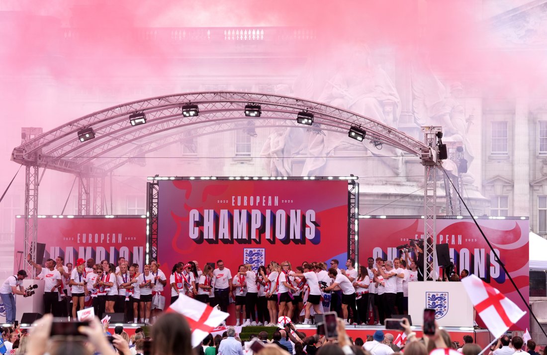 Празненствата започнаха в понеделник, когато отборът се прибра у дома, посрещнат от развълнувани фенове, които не се съобразиха с инструкциите, да не се събират на летището. По-късно вицепремиерът Анджела Рейнър ги посрещна в резиденцията на премиера Киър Стармър на "Даунинг стрийт".