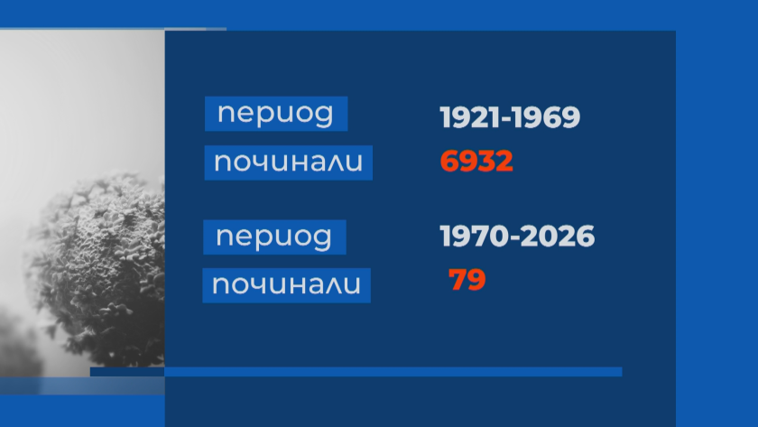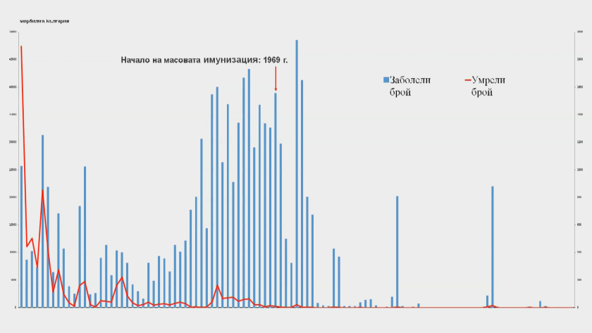 Ето така изглежда кривата на смъртните случаи преди и след масовата ваксинация на населението. 88 пъти разлика в броя на починалите, ако сравним периода между 1921 и 1969 и от 70-те до днес. Всъщност за последните 59 години са починали само 79 души, срещу почти 7000 за 49 години преди ваксинацията.