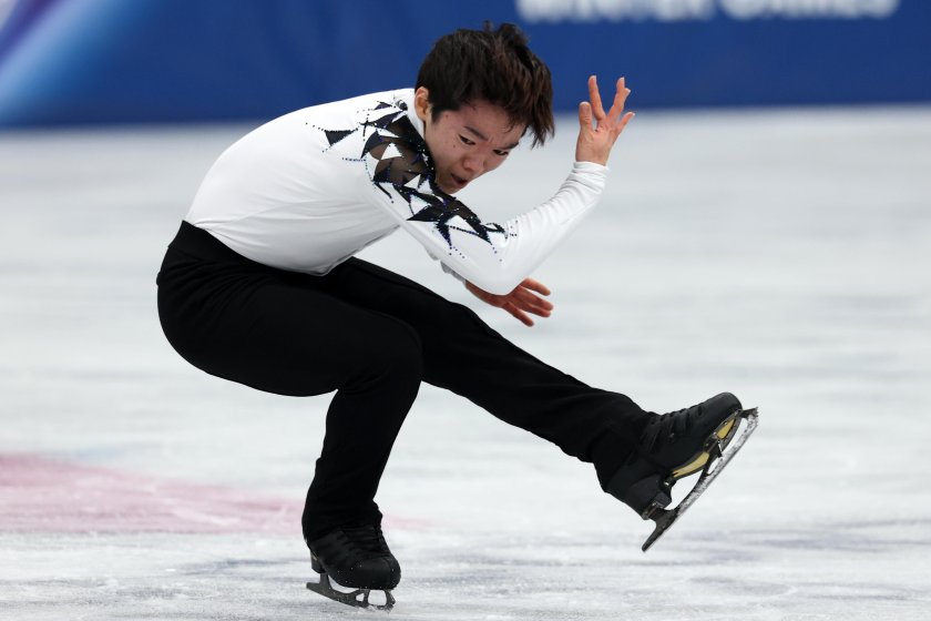 Олимпийският вицешампион Юма Кагияма излезе последен на леда, но допусна грешка при тройния аксел и е втори засега.