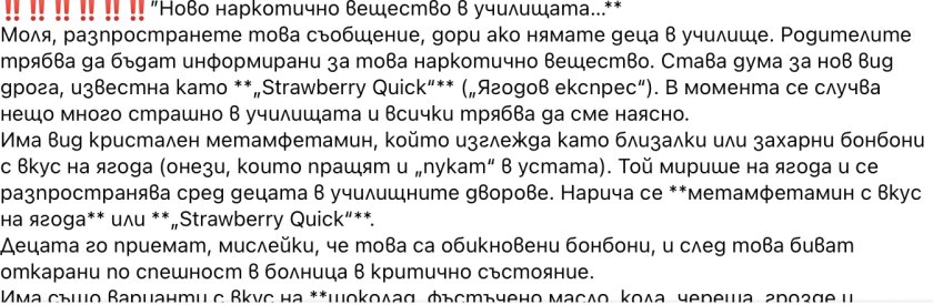 Проверката показва, че такъв наркотик не съществува у нас и разпространените твърдения са напълно неверни. Историята за „бонбоните-наркотици“ Strawberry Quick е интернет мит, който се разпространява циклично и създава излишна паника сред родителите, без да има реално основание.