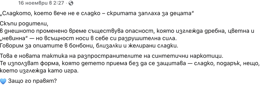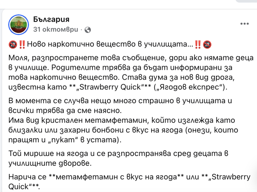 През последните дни публикации в социалните мрежи за бонбони с наркотици, които се раздават на деца в близост до училища достигнаха до хиляди потребители. Част от постовете твърдят, че „бонбоните“ съдържат кристален метамфетамин с аромат на ягода, а разпространените снимки на розови мечета се представят като доказателство за опасност. Това доведе до паника сред родители в много фейсбук и вайбър групи.
