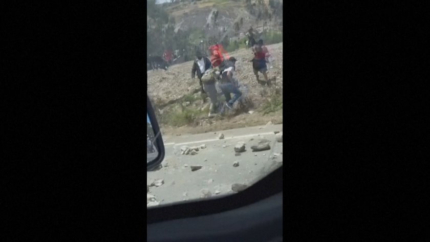 В кадри, заснети от вътрешността на автомобила се вижда как група хора обвити в знамена хвърлят камъни и тухли по колата.