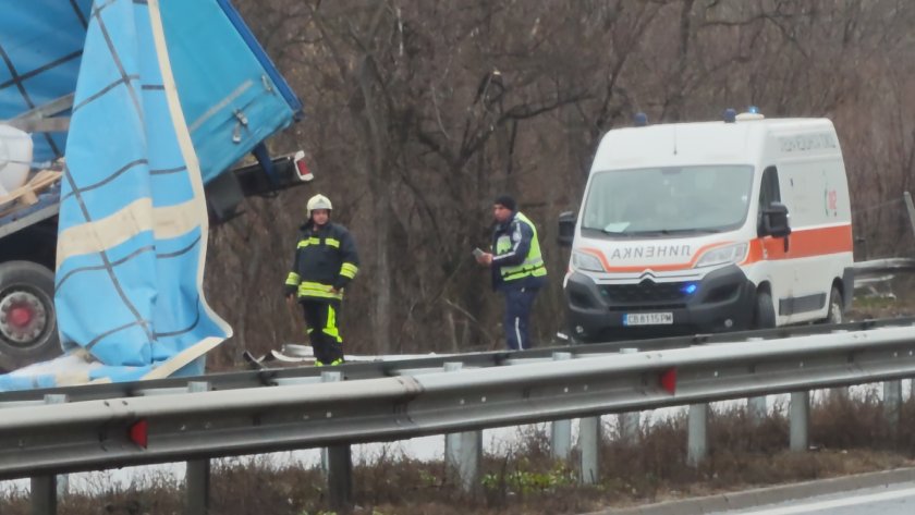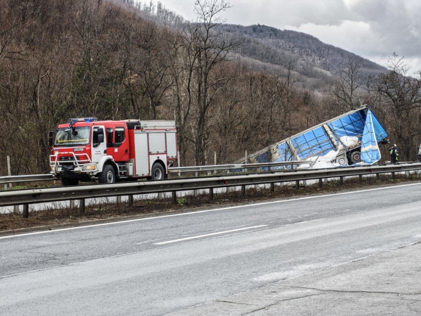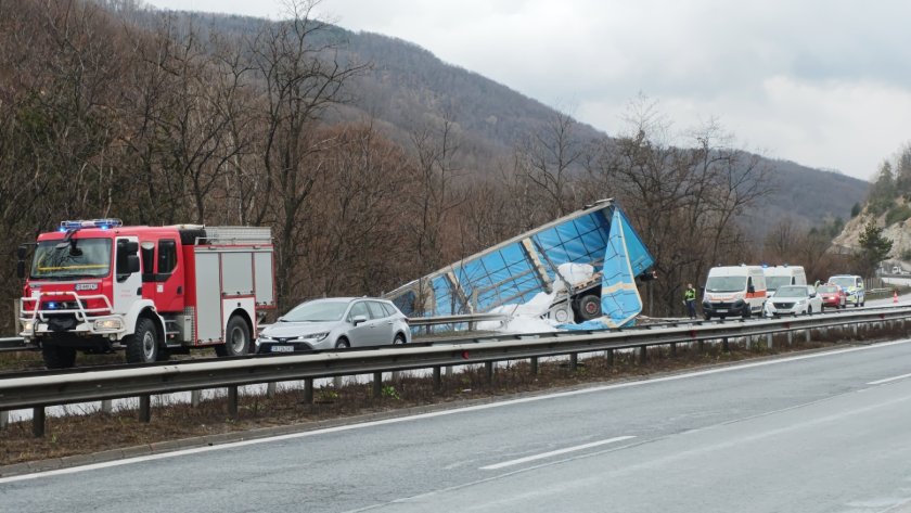 Временно е затруднено движението на АМ "Тракия" при км 56 заради обърнал се тир в канавката.