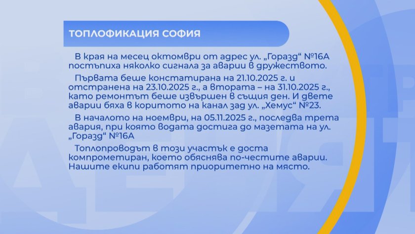 "Случвало се е повече от седмица да няма топла вода. Съответно проблемът е, че не се обръща сериозно внимание на авариите. Те са множество, а се отстраняват на парче. Става въпрос за трасе, което е не повече от 10, 12 метра. Тази тръба се пука постоянно или на много места. Това причинява един непрестанен теч. Нашият приземен етаж не е изсъхвал. Отстранява се едно, а буквално след него започва да тече отново".