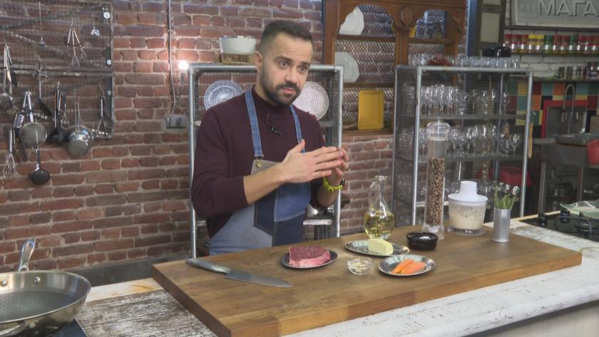 "Ще приготвяме един телешки стек в много масло, за да остане вътре розов, прекрасен и сочен, ще е подкрепен с глазирани и леко карамелизирани моркови и крем от целина. Да започваме."