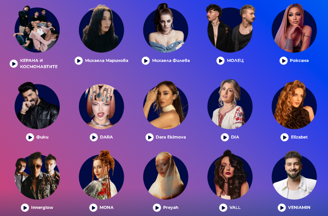 В националната селекция за избор на български представител на "Евровизия 2026" участват Керана и Космонавтите, Михаела Маринова, Михаела Филева, Молец, Роксана, Фики, DARA, Dara Ekimova, DIA, Elizabet, Innerglow, MONA, Preyah, VALL и Veniamin.
