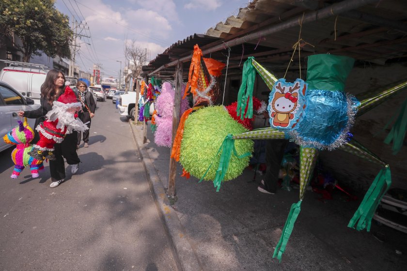 Уличните търговци поставиха щандове и продават шапки и кукли на Дядо Коледа докато жителите се радват и снимат празничната украса.