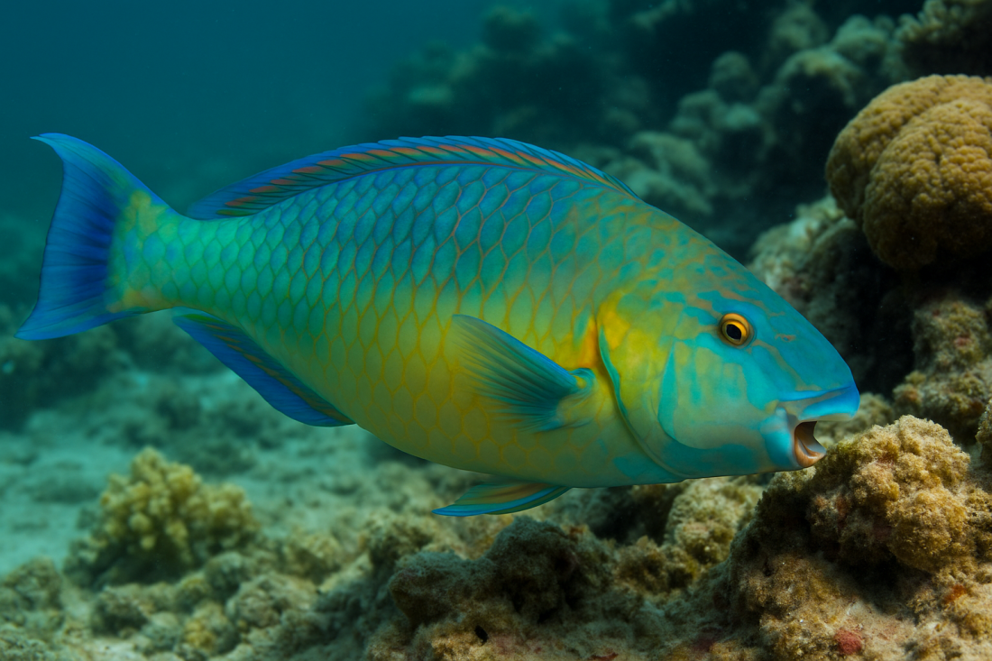 Тук идват папагалските риби. Те са големи, супер цветни и имат усти като човки. Те обожават да ядат водорасли и буквално „пастарят“ рифа. Така освобождават място за нови корали да растат.