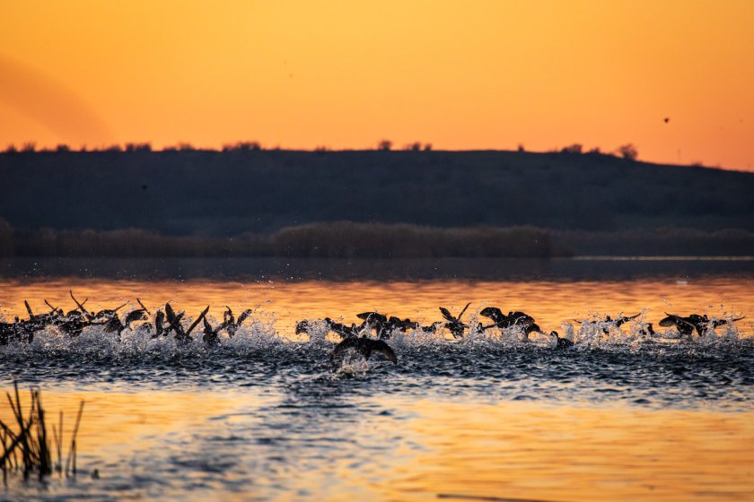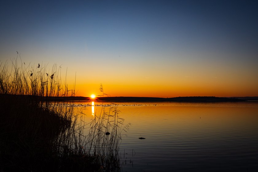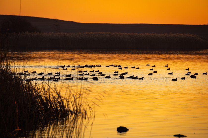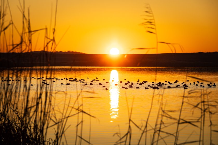 Залез над Мандренското езеро край Бургас. През зимата езерата около града са местообитание за десетки видове птици.