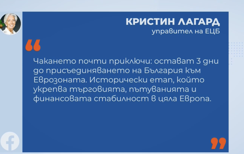България е все по-близо до еврото – това стана ясно от послание на председателя на Европейската централна банка Кристин Лагард. В социалните мрежи тя написа, че „чакането е към края си“ и сподели видео с обратно броене.