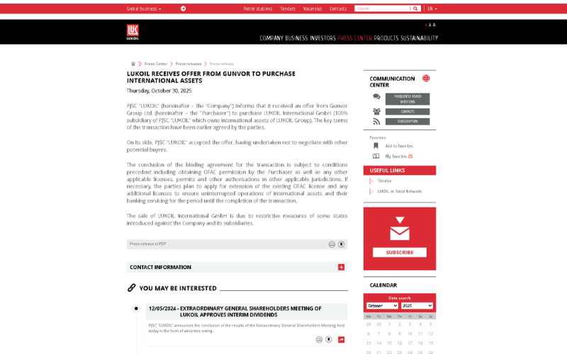 В официалното съобщение на страницата на "Лукойл" се посочва, че продажбата на международните активи се налага заради въведени "ограничителни мерки" от някои държави, без да се посочва кои.