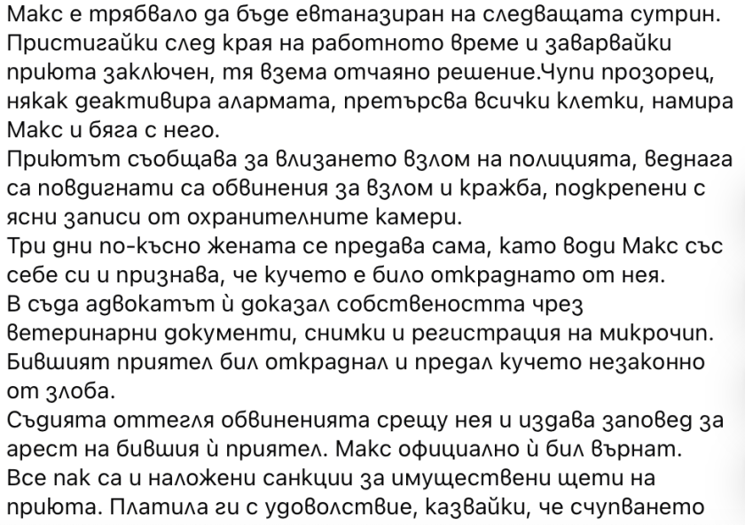 В социалните мрежи масово се споделя емоционален разказ за жена, която разбива приют, за да спаси кучето си от предстояща евтаназия. Според историята животното било предадено в приют без нейно знание, трябвало да бъде умъртвено още на следващия ден, а тя, водена от отчаяние – проникнала в сградата, извела кучето и по-късно се предала. Разказът завършва с твърдение, че съдът е свалил обвиненията, а кучето е било върнато у дома.