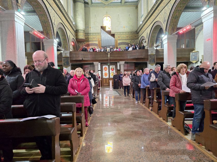 Десетки вярващи, свещеници и монахини днес се събраха в пловдивската катедрала, за да чуят избраника на папа Лъв XIV и да го поздравят.