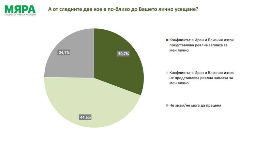 Дали конфликтът представлява лична заплаха – този въпрос предизвиква повече колебание, допълват от "Мяра". 30,7% приемат мнението „Конфликтът в Иран и Близкия изток представлява реална заплаха за мен лично“, но 44,6% са на противоположното мнение: „Конфликтът в Иран и Близкия изток не представлява реална заплаха за мен лично“. Около 25 на сто от запитаните не могат да преценят.