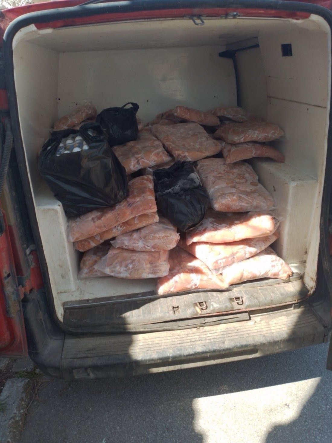В хода на проверката инспектори от Областна дирекция по безопасност на храните - Хасково са намерили около 550 кг замразено пилешко филе, 150 яйца и 9 кг кашкавал без идентификационна маркировка, документи за произход и етикети на български език.