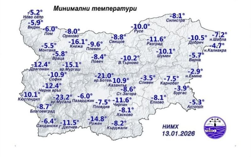 Това са минималните за денонощието температури, отбелязват от НИМХ и допълват, че в 8:00 часа стойностите са били други.