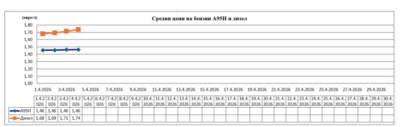 Цената на бензин А95 се запазва 1,46 евро. От началото на месец април дизелът е поскъпнал с 6 цента. От началото на военните действия в Близкия изток дизелът е поскъпнал с 47 цента.