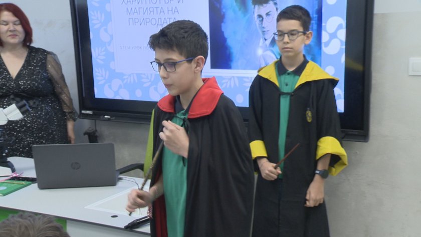 С мантии и „вълшебни“ пръчки ученици влязоха в ролята на Хари Потър и показаха научни експерименти пред своите съученици.