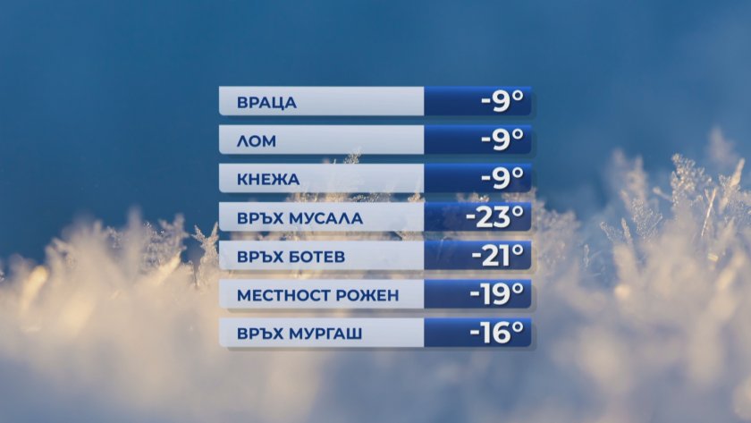 Най-ниски температури тази сутрин са измерени във Враца, Лом и Кнежа, където термометрите са отчели минус 9 градуса. На връх Мусала измерената температура е била минус 23 градуса, а на връх Ботев минус 21 градуса. В местността Рожен температурата тази сутрин е била минус 19 градуса.