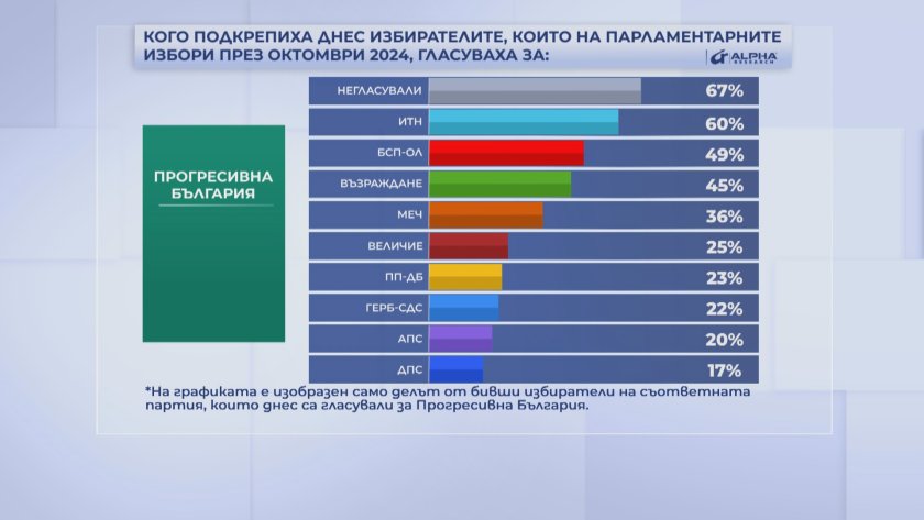 45 на сто от симпатизантите на "Възраждане" също са предпочели "Прогресивна България". Това се е случило и с 36 % от гласувалите за МЕЧ, 25% от избирателите на Величие, 23 % от симпатизантите на ПП-ДБ и 22 на сто от гласувалите за ГЕРБ. От социологическа агенция "Мяра" представят данните в друг аспект-в брой гласове. Общо "Прогресивна България" е получила 1 млн. и 400 хил. гласа. 200 хиляди са на хора, негласували на предишните избори.