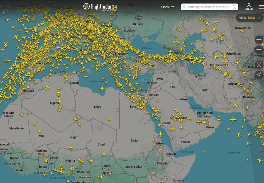 Справка на сайта Флайрадар показва, че в момента е затворено въздушното пространство освен над Иран, също така над Ирак, Сирия, Либия, Израел, Йордания, Кувейт и Обединените арабски емирства. Над Арабския полуостров летят преди всичко военни самолети.