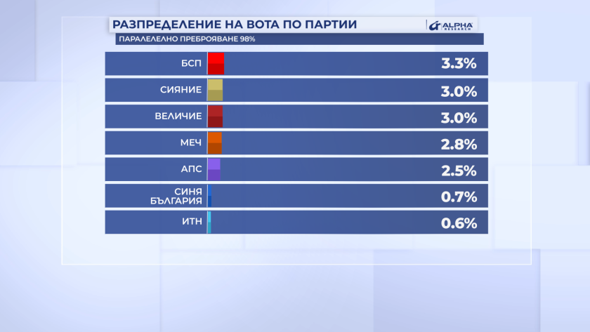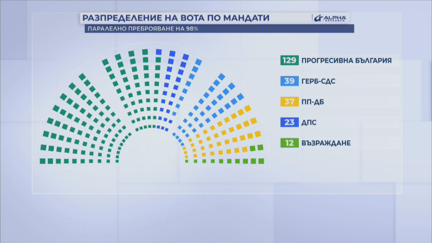 Според данните към 98% паралелно преброяване на "Алфа Рисърч" мандатите се разпределят: