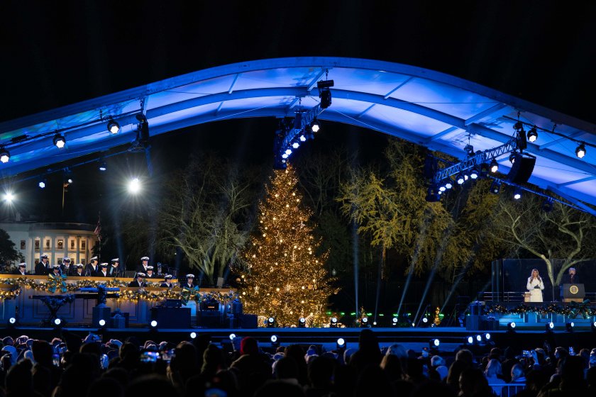 На ежегодното палене на светлините на дървото, южно от Белия дом, президентът Доналд Тръмп каза пред събралите се, че първата дама ще има честта да ги запали и сам преброи от пет до нула.
