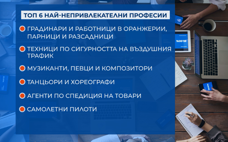 Именно условията на труд поставят други 6 професии в класацията на най-малко предпочитаните. Най-нежелана сред тях, въпреки голямото търсене на пазара, се оказва тази на пилота заради високите такси за обучение и отговорността.