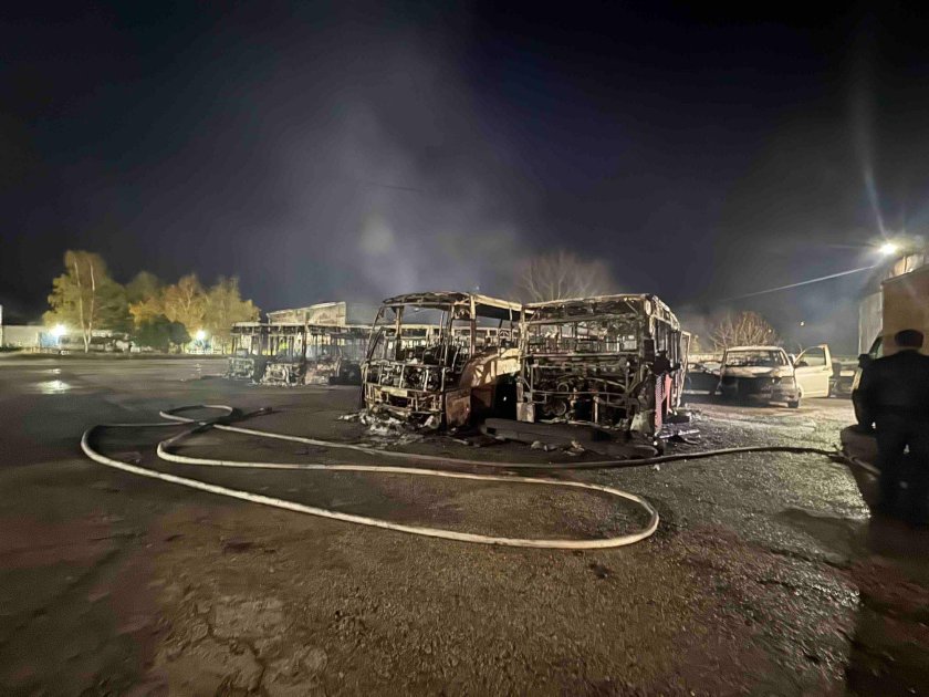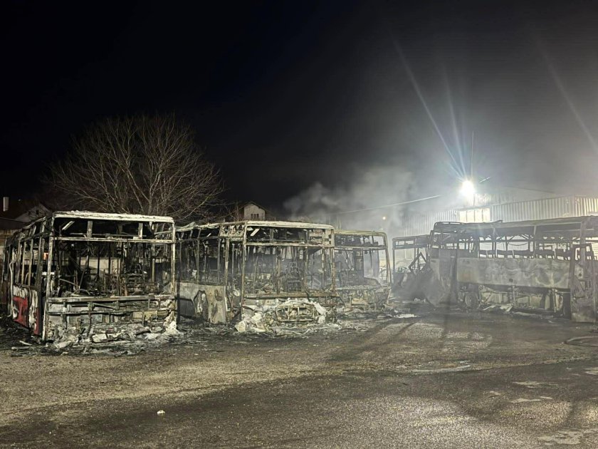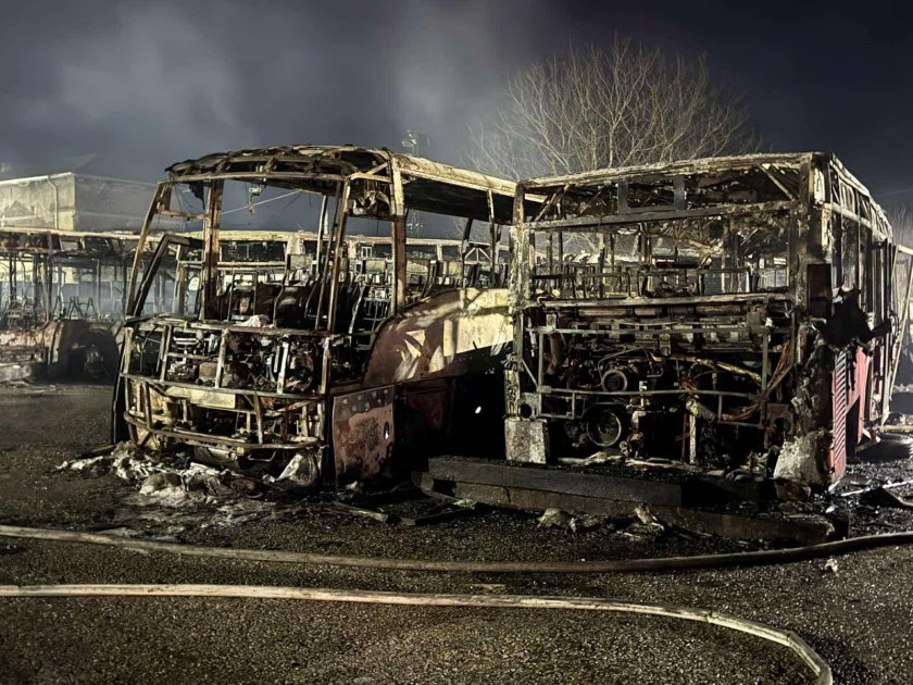 Напълно са изгорели два буса, два леки автомобила и 5 автобуса, сред които един ученически. Пожарът е плъзнал и към халето на базата, но екипите на пожарната в Костинброд са успели да потушат пламъците преди да се стигне до по-сериозни щети.