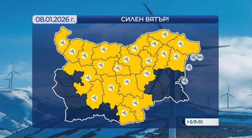 И днес максималните температури ще останат в много широки граници - между 2 и 17°, в София - около 11. В по-голямата част от страната ще продължи да духа умерен и силен южен вятър, но от северозапад ще започне да нахлува по-студен въздух и с понижението на температурите през нощта в Северозападна България ще има условия за образуване на поледици. Валежите ще продължат и в крайните южни райони от страната, където е обявено предупреждение за значителни количества.